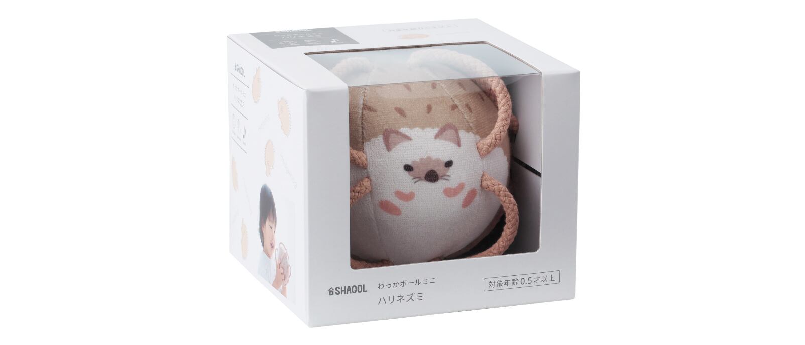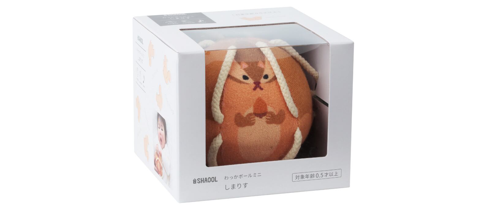 わっかがついたカラフルな生き物のデザインの「わっかボール」は、好奇心旺盛な赤ちゃんのためにつくられた布製ボールです。身の回りのものに興味が出てくる生後6か月頃は、まだ手の力が弱く、ものをつかんで遊ぶのは難しい時期です。赤ちゃんに芽生えた好奇心の芽を健やかに伸ばしていくために、柔らかい紐のわっか(輪)を取り付け、赤ちゃんでも持ちやすいボールにしました。